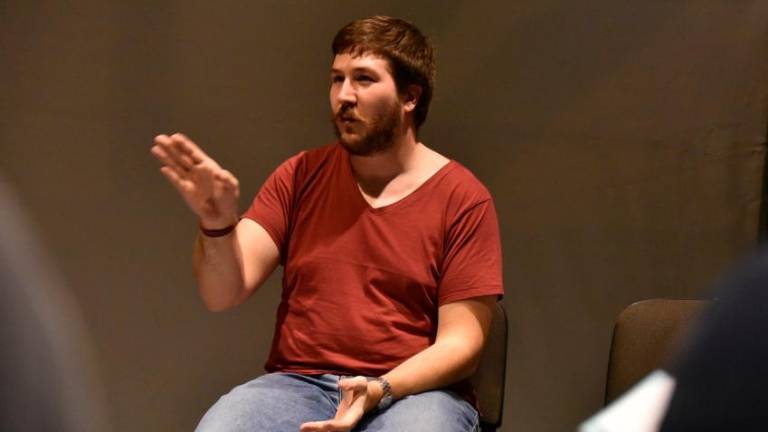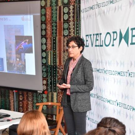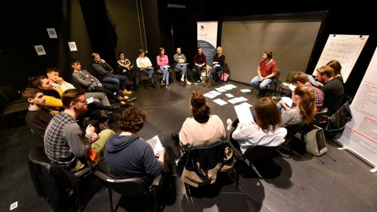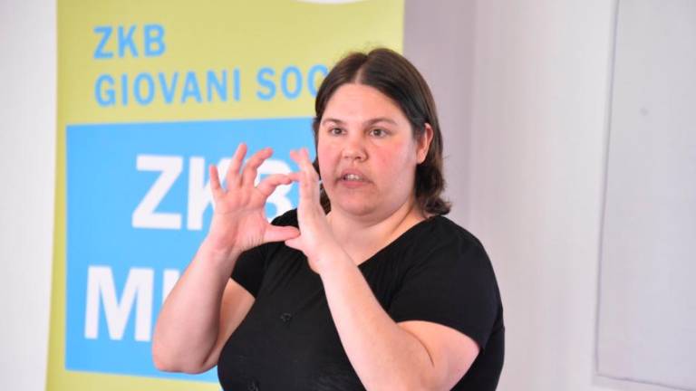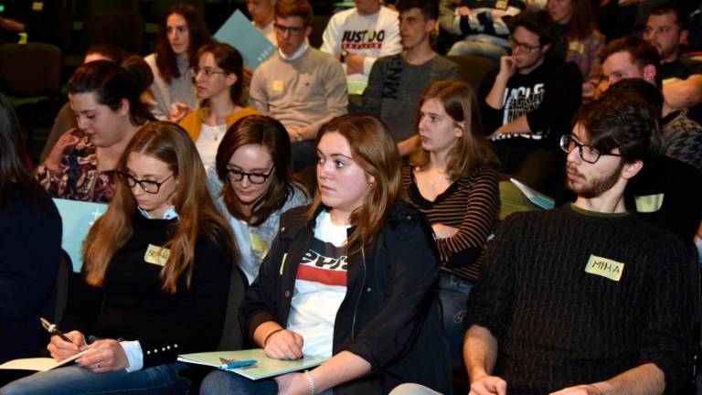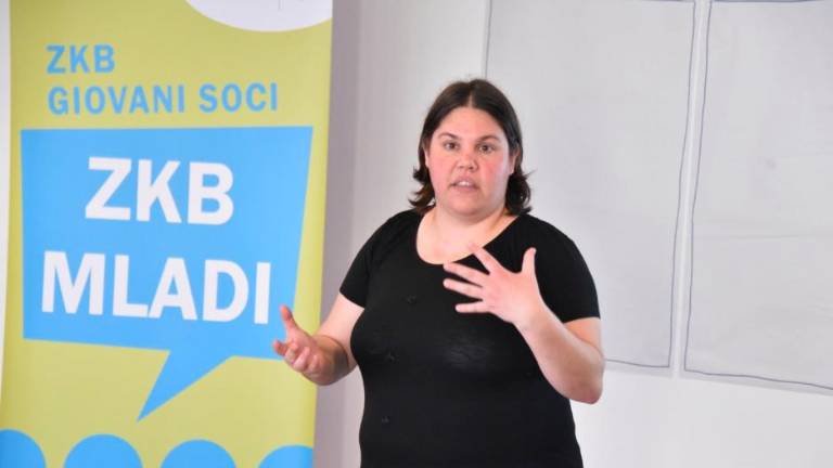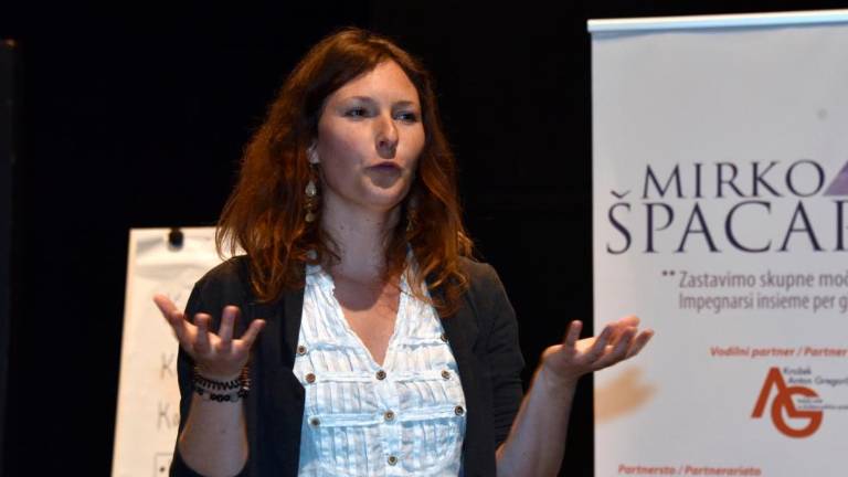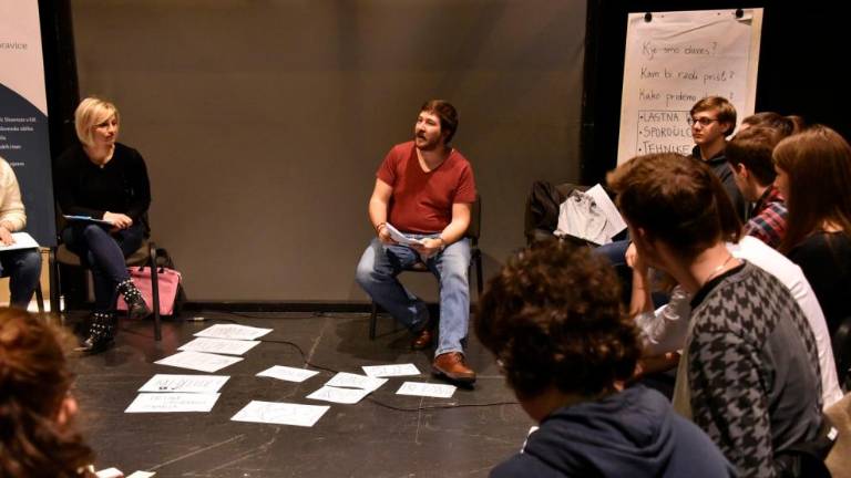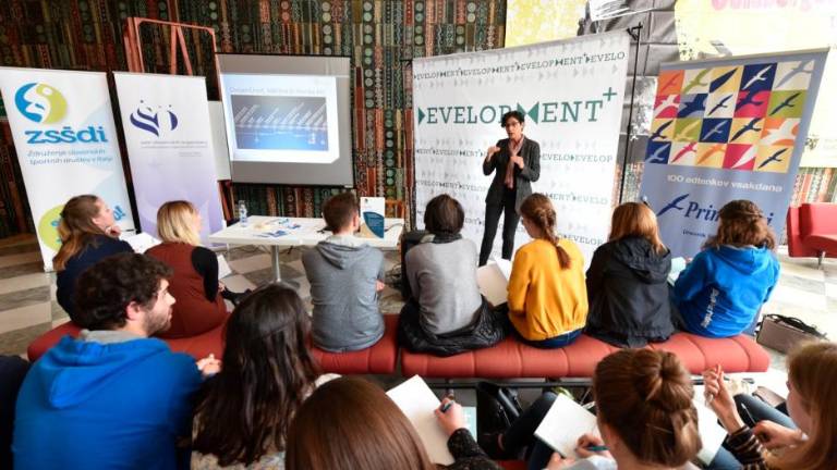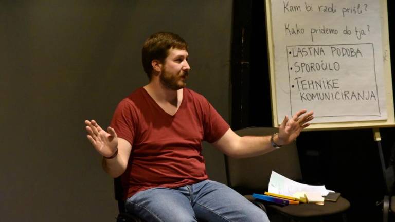 V Kulturnem domu so udeležence nagovorili Lucija, Neža, Jasmin, Danijel in Jan - organizatorji niza izobraževanj DevelopMENT (ali DM+) v sklopu projekta Zastavimo skupne moči za skupne cilje.