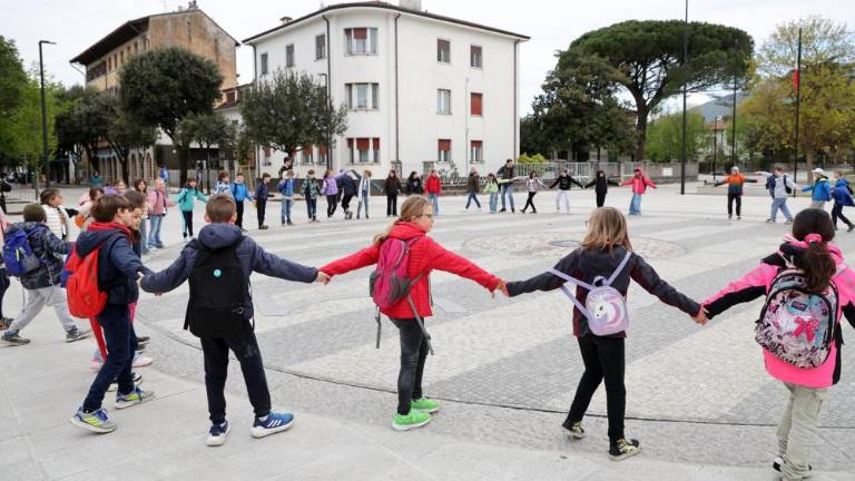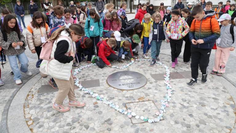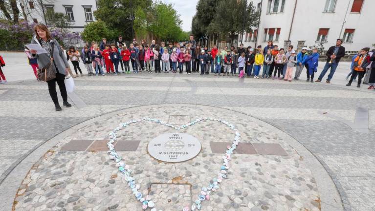 S Trga Evrope / Transalpina je včeraj dopoldne odmevalo otroško petje. Tu se je okrog Vecchietovega mozaika zbralo 171 učencev treh šol iz treh držav. Prisotni so bili osnovnošolci iz Bračana (Italija), Tržiča (Slovenija) in Celovca (Avstrija). Dogodek, ki mu je sledil ogled Gorice, je organiziral EZTSGO, v imenu katerega sta bili prisotni tudi Romina Kocina in Chiara Artico.