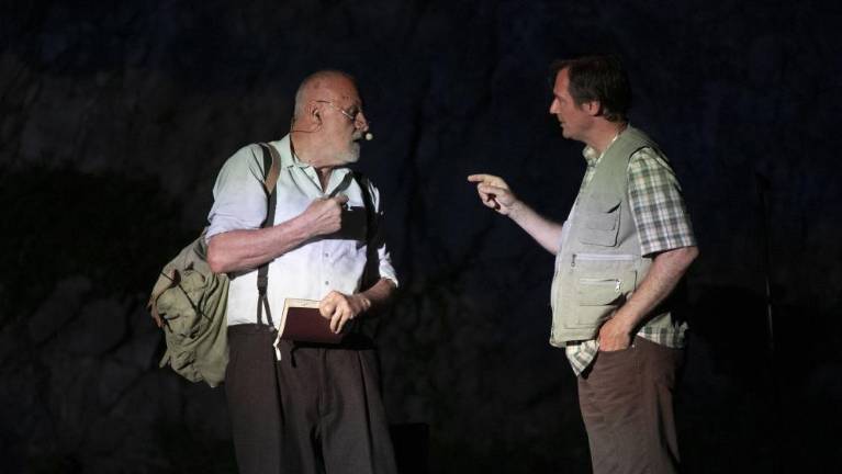 Režiserka Jasmin Kovic je povezala celoto (in širino prizorišča) z idejo sprehoda, saj sta se protagonista sprehajala na poti skozi več malih odrov, sprevod pevcev alpinskega zbora sredi poglavja o vojni pa je dodal sugestivno noto spomina (skupaj s petjem kultne Stelutis alpinis). Nevsiljivo, spremljevalno, a bistveno vlogo so odigrale projekcije kraške pokrajine na velikem platnu stene kamnoloma (ustvarila sta jih Sybil Calligaris in Peter Persoglia).