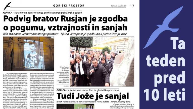 Danes nadaljujemo obujanje spominov s prispevkom o odkritju kipa bratoma Rusjan pred pokrajinsko palačo v Gorici. Članek je bil objavljen v četrtek, 26. novembra 2009.