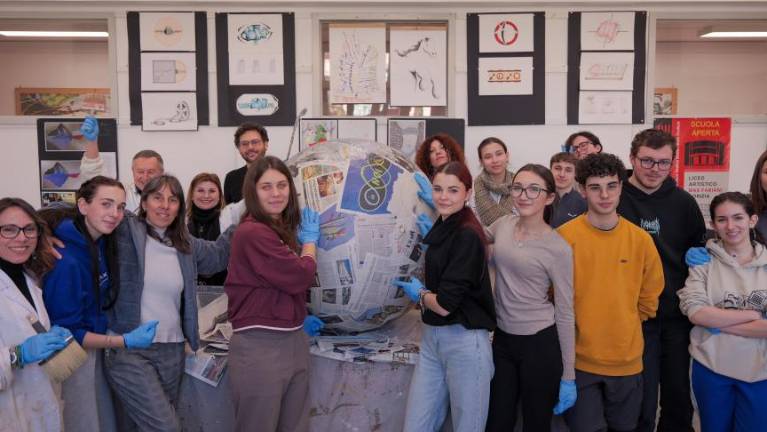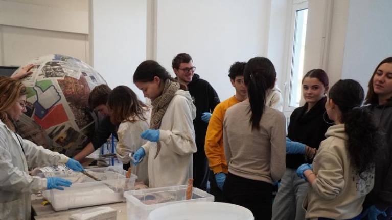 »Izberite članke in strani, ki se vam zdijo najbolj pomembni, robove morate potrgati,«je dijake na začetku napotil Saverio Teruzzi iz Fundacije Pistoletto Cittadellarte. Okoli dvajset dijakov tretjih, četrtih in petih razredov je v spremstvu profesorjev Ivana Crica, Michele Appugliese in Giovanne Bellanca ustvarilo goriško verzijo potujoče krogle, ki velja za eno izmed najbolj poznanih instalacij umetnika Michelangela Pistoletta.
