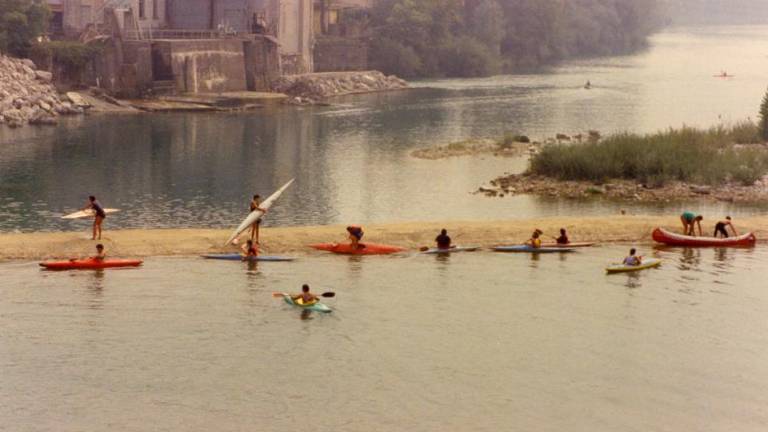 K članku pristavljamo fotografijo iz leta 1987, iz časa 2. Soške regate, ko je pod Podgoro jez še stal in so ga morali kajakaši »preskakovati«, kar ni bilo ravno enostavno. Že naslednje leto je deroča Soča odnesla dobro polovico rečne pregrade, drugo polovico pa odstranjujejo prav te dni.