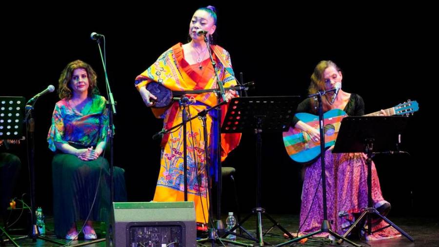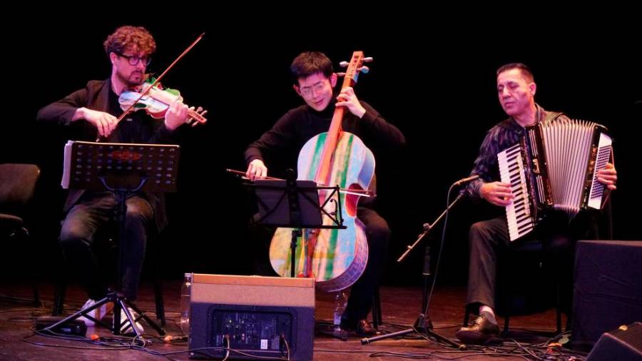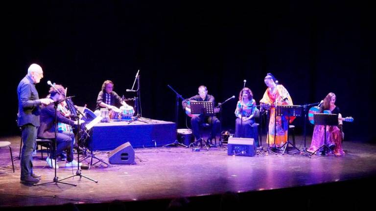 Med jezikoslovnimi simpoziji so sobotni večer namenili prepletu besede in glasbe, ki so ga uprizorili tržaški novinar, pisatelj in popotnik Paolo Rumiz ter člani ansambla Piccola Orchestra dei Popoli iz Milana. Kot pove ime, je osemčlanski ansambel svet v malem: violino igra Italijan, čelo Japonec, harmoniko Romun, tolkala (table) Indijec, lutnjo Libanonec, kitaro Kubanka, oba tudi pojeta, prav tako tudi Albanka in Japonka, ki petje spremlja na značilnem inštrumentu šin in.