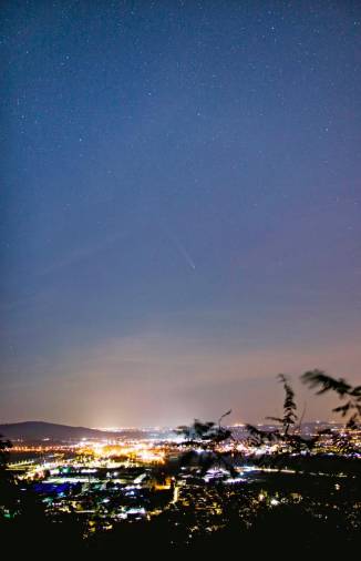 Komet Tsuchinshan-Atlas so včeraj opazovali tudi na Goriškem, poročajo Primorske novice. Čeprav je bil s prostim očesom še komajda viden, ga je nad Šempetrom pri Gorici v fotografski objektiv ujel fotograf Andrej Konič. Na Cerju pa ga je včeraj zvečer fotografirala tudi učenka OŠ Milojke Štrukelj Nina Novak.