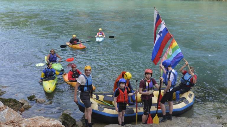 »Osvoboditev« je prišla po vodi. En gumenjak in šest šilcev- kajakov je danes švignilo po Soči. Skupno dvanajst veslačev; na kopnem jim je sledilo prav toliko spremljevalcev, ki so skrbeli za fotografiranje, okrepčilo, bodrilo in razlago gledalcem na nekaterih vmesnih točkah od začetka pod Žogico mimo tribun nad solkansko tekmovalno progo do pevmskega mostu in priveza v istoimenskem parku.