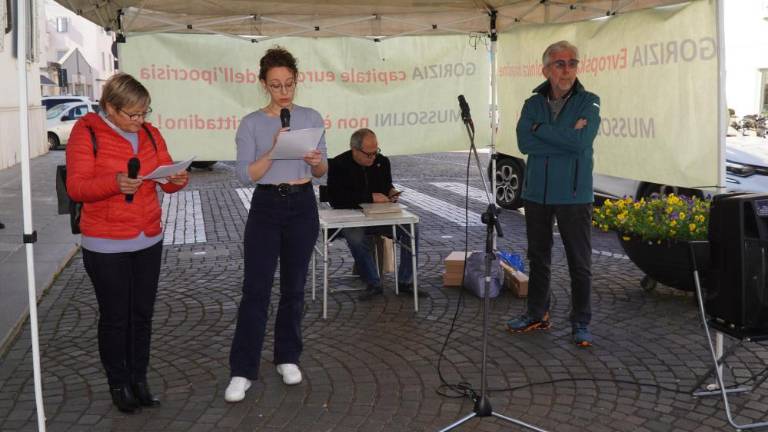 Približno šestdeset udeležencev sta včeraj uvodoma nagovorili Angelica Stasi in Romana Leban, dogodek je v nadaljevanju povezoval Marko Marinčič, ki je med drugim povedal, da je doslej peticijo za odvzem častnega meščanstva Mussoliniju podpisalo preko tisoč ljudi. Vnadaljevanju je prebral pismi, ki sta ju poslala župana Gorice Rodolfo Ziberna in Nove Gorice Samo Turel. Goriški župan je poudaril, da je shod nova provokacija, s katero si njegovi prireditelji prizadevajo, da bi skrhali prijateljske, vse tesnejše odnose med Gorico in Novo Gorico. Ziberna je obnovil razloge za zavrnitev zahteve po odvzemu meščanstva Mussoliniju in potrdil, da ne bo nikoli zahteval od Nove Gorice in Slovenije, naj se izrečeta proti Titovemu komunizmu, saj gre za dinamike, ki po njegovi oceni pripadata izključno sosednji občini oz. državi. Turel je odgovoril, da se skupaj z občino Gorica usmerjajo v prihodnost sožitja, prijateljstva in razvoja, zato želijo zgodovino prepustiti zgodovini. »Odpiranje tovrstnih tem se mi v tem pogledu ne zdi konstruktivno, saj zagotovo ne prispeva k temu cilju,« je zapisal Turel. Marinčič je prebral še pismo, ki ga je 1. februarja poslal programski vodja Zavoda GO! 2025 Stojan Pelko.