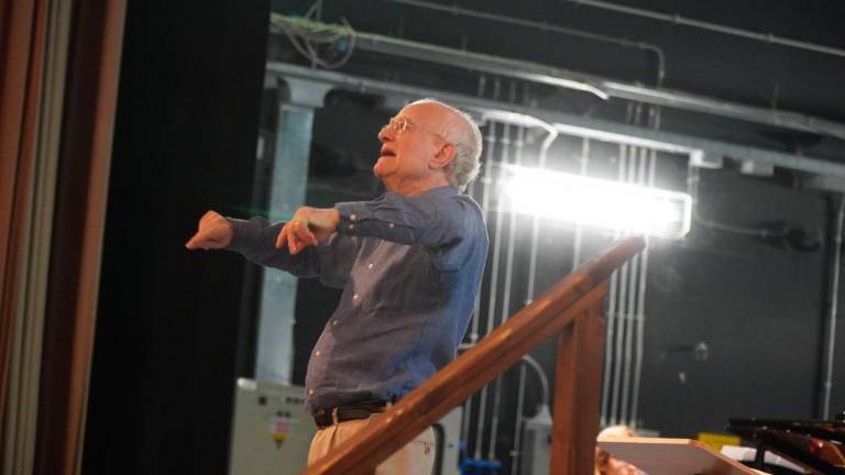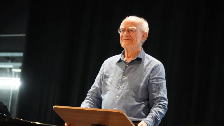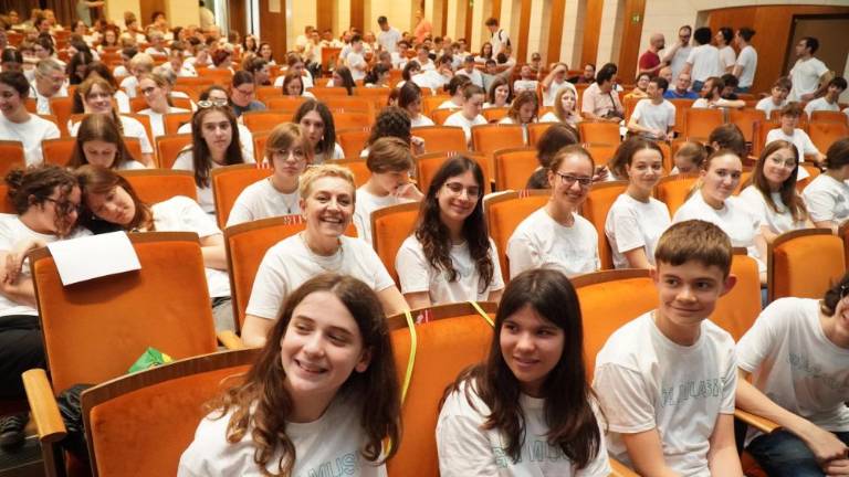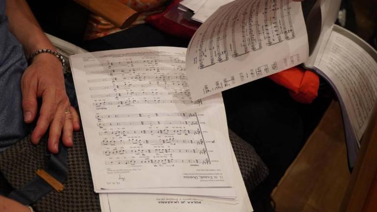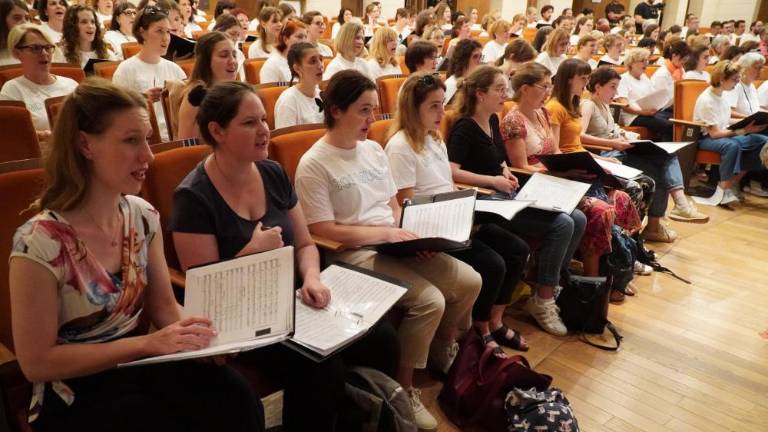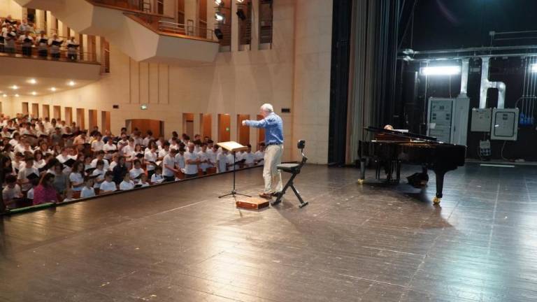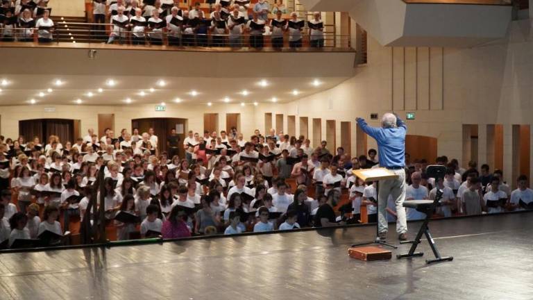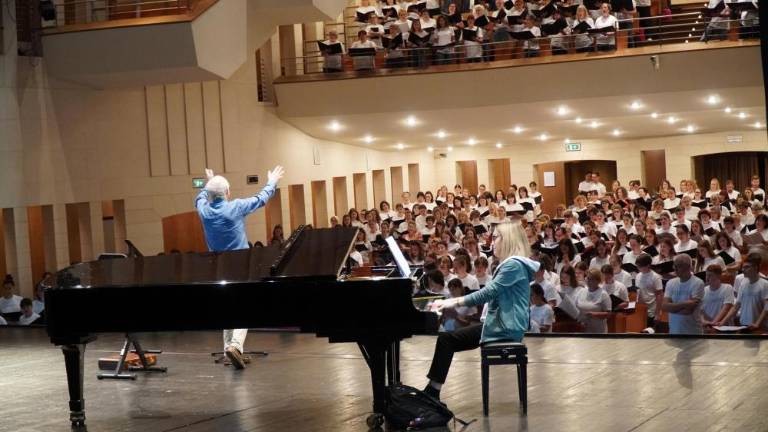 V gledališču Verdi je popoldne potekala vaja koncerta »For The Beauty of the Earth / A song for peace«, ki ga bo pod večer na Travniku pod vodstvom skladatelja Johna Rutterja izvedlo 700 pevcev in glasbenikov z obeh strani meje.