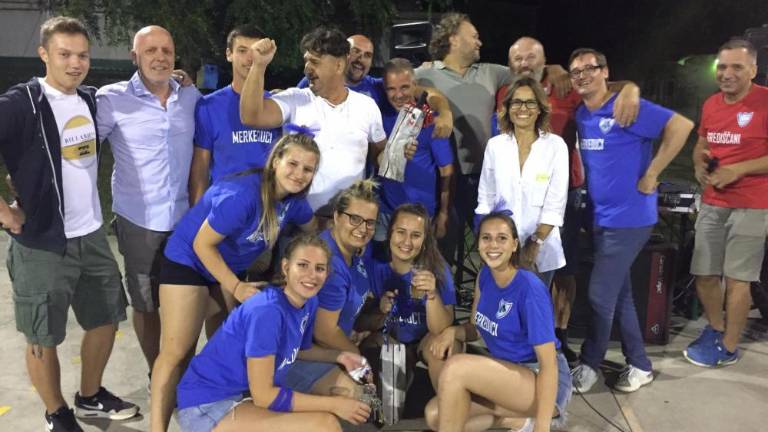 Merkeduci so zmagovalci tekme v »cukanju štrika«, ki jo je društvo Dob izpeljalo v soboto v doberdobskem občinskem parku, potek ko jo je moralo prejšnji teden odložiti zaradi dežja. Ko so se prvič pomerili moški, so vrv vlekli tako močno, da se je utrgala in večina tekmovalcev je padla na tla.