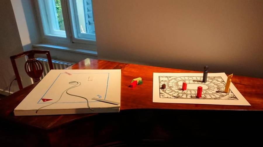 Na večji polici sta bili postavljeni dve Vecchietovi deli: prvo, z naslovom Suite iz leta 1988, je reprodukcija stare družabne namizne Igre gosi, ki jo je umetnik izdelal iz kartonaste embalaže, kože, vrvi in gumijaste pene. Posebej je izdelal osem lesenih barvnih pokončnih elementov, s katerimi se soigralci premikajo do cilja po metu kock. Poleg tega dela je bila na polici manjša knjiga umetnika rumene barve Mystery Book, z zbirko tridesetih dni plus enega, ko so se vedno ob isti uri srečevali umetniki, da bi skupaj načrtovali likovni projekt. Glede na težko uresničljivost idej so le te ostale le na papirju kot pričevanje skupinske možganske vihre.