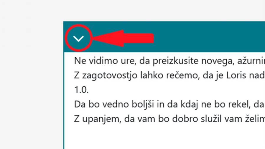 V uporabniškem vmesniku kliknemo puščico v levem zgornjem kotu pogovornega okna, v modri pasici kjer se nahaja tudi gumb »loris Svetuj!«