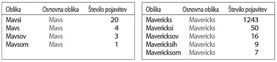Če pogledamo rabo, lahko vidimo, da se te posamezne kategorije obnašajo nekoliko drugače – publikacije se pogosteje sklanjajo edninsko (v New York Timesu), glasbene skupine in športne ekipe pa množinsko (Beatlesi/Rolling Stonesi in New York Knicks/Green Dragonsi). Za ponazoritev na sliki podajamo podatke iz korpusa Gigafida, tako za obliko Mavericks kot tudi neformalno, skrajšano obliko Mavs.