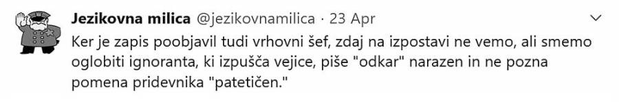 Težko rečem, ali imajo prav ali ne; vem le, da je vejica v slovenščini prav posebno nadležna – od tod tudi naslov današnjega prispevka, ki pa je zavajajoč: vejica ni problematična zgolj pri mladini (kot to velja za rano uro), temveč je veliki izenačevalec – vse nas druži obupavanje nad njo, ne glede na starostno, geografsko ali religiozno pripadnost. Vejica je v resnici šiba, ki mlati vsepovprek, brez vsake diskriminacije ali ideologije. Posledično je za tiste, ki z vejico vendarle znajo ravnati (ali pa tako vsaj mislijo), to močno retorično orožje – bog obvaruj siromaka, ki se na Twitterju pregreši zoper stavo vejice, če pa je še politik, je javna kritika neizbežna. V nadaljevanju izpostavljamo zgolj en, zelo vljuden primer, pri katerem uporabniki Twitterja znanega slovenskega politika, ki ga ne bomo imenovali, izobrazijo o rabi vejice.