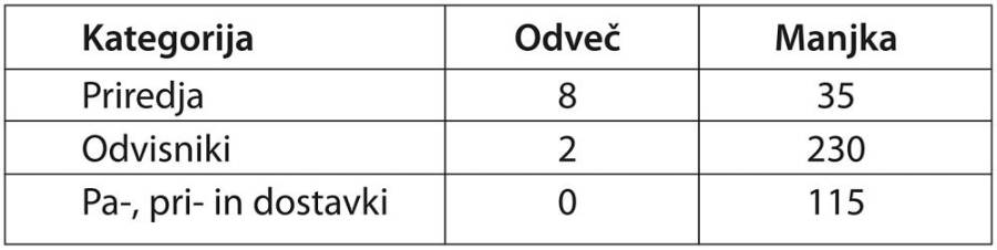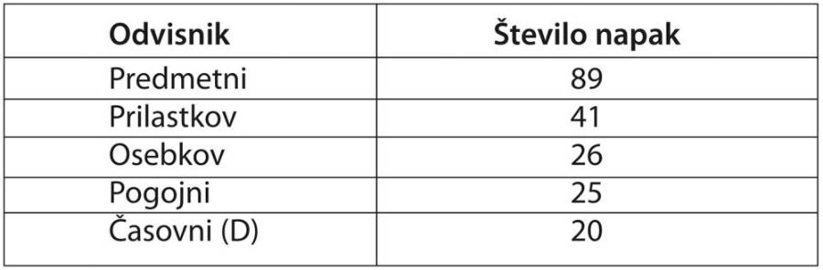 Odvečna vejica torej skorajda ne predstavlja težave (skupno je bilo v podatkovni zbirki zgolj 19 primerov), prav tako niso problematična priredja, velika večina napačno stavljenih vejic pa je manjkajočih (382 primerov). Najbolj nas očitno mučijo manjkajoče vejice pri odvisnikih (kar 230 primerov) in pa-, pri- in dostavčnih strukturah (115 primerov). Pri teh gre najpogosteje za strukture tipa »Ja, pridem« in »Zdravo, Peter«, pri katerih vejica je, pa jo pogosto izpuščamo. Pri odvisnikih pa lahko natančno identificiramo krivce za najpogostejšo neposvečeno stavo, ki jo prikazujemo z naslednjo tabelo.