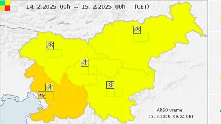 Arso je za jutri za celotno Slovenijo objavil rumeno vremensko opozorilo zaradi sneženja, za jugozahod Slovenije pa oranžno vremensko opozorilo zaradi močne burje. V 24 urah pričakujejo do 10 centimetrov snega. Sunki burje pa bodo dosegali hitrost do 100 kilometrov na uro, opozarjajo.