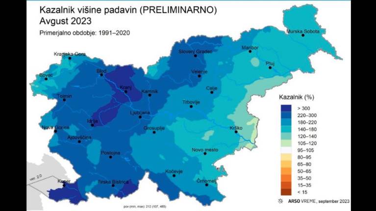 Temperatura zraka je bila v Sloveniji v primerjavi s primerjalnim obdobjem 1991–2020 višja za 0,6 stopinje Celzija, kar umešča avgust 2023 med okrog 16 najtoplejših od leta 1950. Višina padavin pa je bila, podobno kot smo poročali tudi za FJK, v Sloveniji na državni ravni močno nad dolgoletnim povprečjem. Kazalnik višine padavine je v Sloveniji znašal 212 %, kar uvršča letošnji avgust na drugo mesto najbolj mokrih, je zapisal Arso.