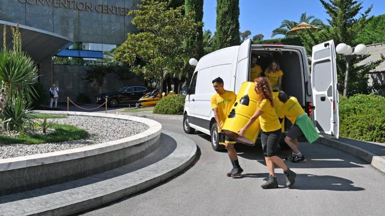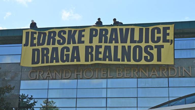 Mednarodni kongres o jedrski energiji, ki poteka ta teden v portoroškem hotelu Bernardin, se je včeraj začel s protestno akcijo aktivistov okoljevarstvene organizacije Greenpeace Slovenija. Protestniki so uro pred začetkom konference pred vhod v hotel postavili tri rumene sode, sredi katerih so naslikali črn znak za radioaktivne snovi, s strehe hotela pa so razvili transparent, na katerem je pisalo »Jedrske pravljice, draga realnost«. Med govorom državnega sekretarja za nacionalni jedrski program Danijela Levičarja pa je aktivistka razpela transparent s sporočilom »Elite fantazirajo, ljudje plačujemo«.