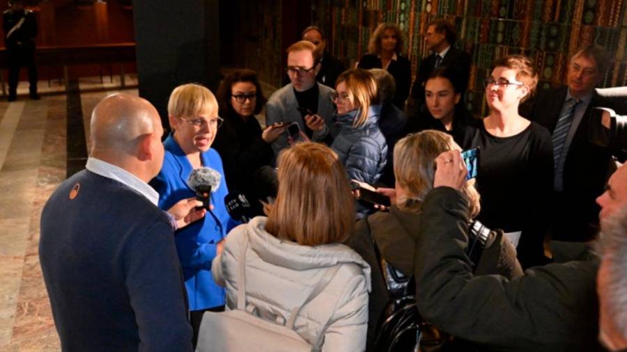 V vhodni avli si je ogledala tudi razstavo o slovenskem skladatelju Ubaldu Vrabcu in odgovarjala na vprašanja slovenskih in italijanskih novinarjev.