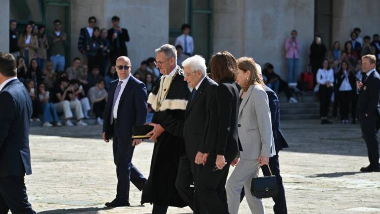 Italijanski predsednik republike Sergio Mattarella je prispel na Univerzo v Trstu, pri glavnem stopnišču na Trgu Evrope so ga sprejeli predstavniki institucij, vključno z ministrico za univerzo Anno Mario Bernini in gostiteljem, rektorjem Robertom Di Lenardo. Ta se je z Mattarello in nekdanjim slovenskim predsednikom Borutom Pahorjem nato sestal na rektoratu, nakar se je v zborni dvorani začela slovesnost ob podelitvi častnega doktorata obema visokima gostoma, kar predstavlja novo dejanje v zgodbi, ki sta jo Mattarella in Pahor začela pisati julija leta 2020 ob skupnem obisku Narodnega doma v Trstu ter spomenikov slovenskim antifašistom in pobitim Italijanom v Bazovici.