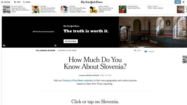 V spletnem časopisu New York Times je Slovenija država tedna. Obiskovalci lahko odgovarjajo na kviz in jo tako spoznavajo. Za posamezna vprašanja so možni štirje odgovori. V primeru pravilne izbire se vprašanje obarva zeleno, če je odgovor zgrešen pa rdeče. Po izbiri odgovora se pojavi besedilo z razlago.