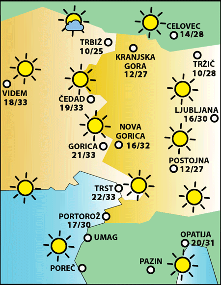 Danes bo na obali in v nižini jasno, v hribih pa rahlo oblačno. V Predalpah se bodo lahko pojavljale padavine ali nevihte. Dopoldne bo na obali in na vzhodnem pasu pihala zmerna burja. Na obali in v nižini bo soparno.