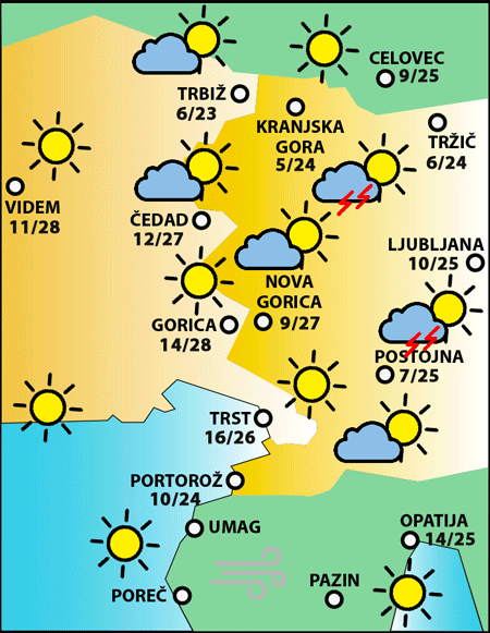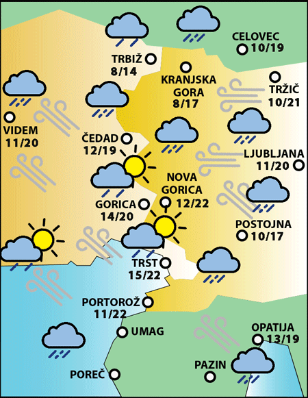 Jutri bo pretežno oblačno. Dopoldne bo na obali več jasnega vremena. V nižinah se bodo pojavljale obilne padavine. Meja sneženja bo na nadmorski višini 2300-2500 m, zvečer se bo znižala na 2000 m. Na obali bo pihal zmeren veter z možnimi nevihtami. V visokogorju bo pihal jugovzhodni veter.