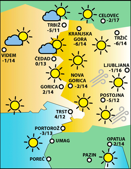 Jutri bo večinoma jasno. V alpskih dolinah se bo pojavila temperaturna inverzija. Zjutraj bo več oblačnosti zlasti v predalpskem svetu. V nižinskem pasu bo ponoči lahko še zmrzovalo. Ničelna izoterma bo na nadmorski višini okoli 2200 m.