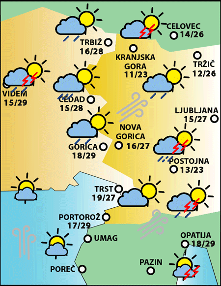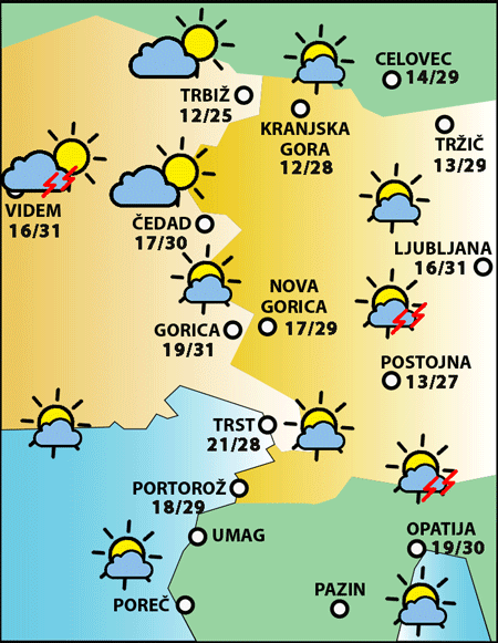 Vremenska napoved Hidrometeorološkega zavoda Republike Slovenije in deželne meteorološke opazovalnice ARPA.