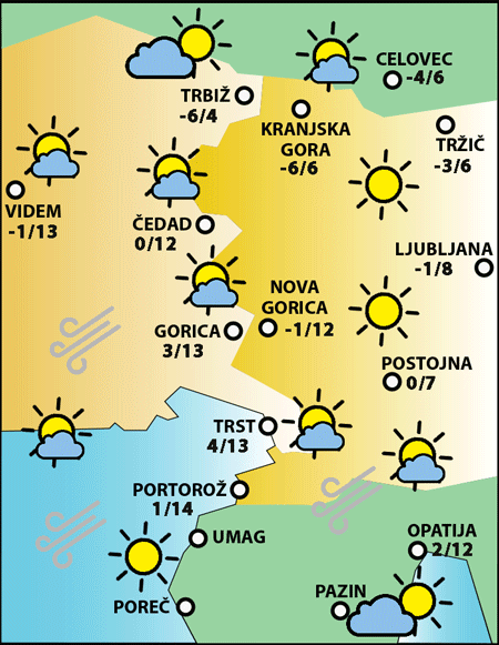 Jutri bo prevladovalo rahlo oblačno vreme zaradi visokih oblakov od popoldneva. V nižinskem pasu bo zjutraj zmrzovalo. Na obalnem območju bo pihala šibka do zmerna burja. Ničta izoterma se bo zvečer naglo spustila do okoli 1200 m zaradi prihoda hladnejšega zraka od severa.