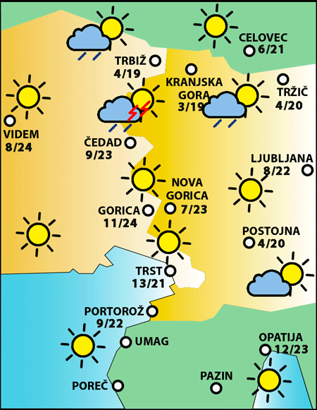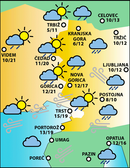 Vremenska napoved Hidrometeorološkega zavoda Republike Slovenije in deželne meteorološke opazovalnice ARPA.