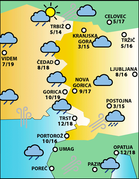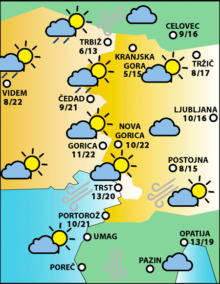 Najnižje jutranje temperature bodo od 3 do 9, najvišje dnevne od 14 do 18, na vzhodu do 21 stopinj C.