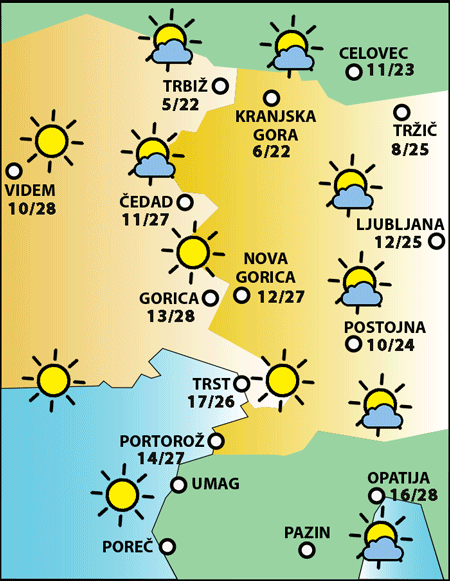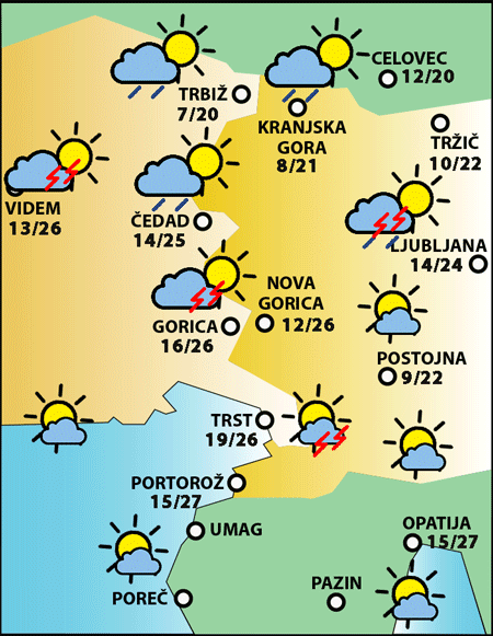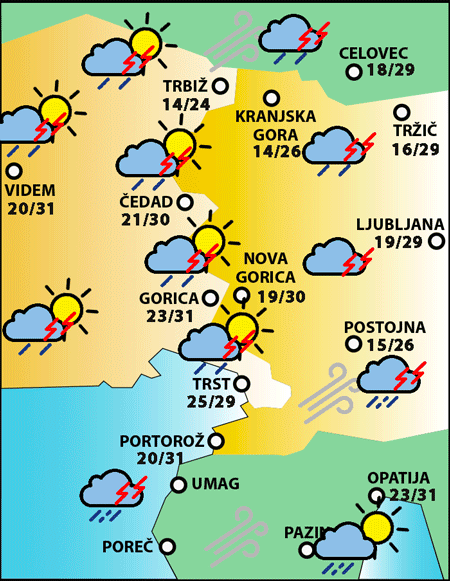 V hribih bo oblačno vreme s plohami in nevihtami. Na obali in v nižini bo vreme spremenljivo z možnimi padavinami in nevihtami. Dež in nevihte se bodo lahko pojavljale predvsem popoldne. Možna bo kakšna močnejša nevihta. Ohladilo se bo.