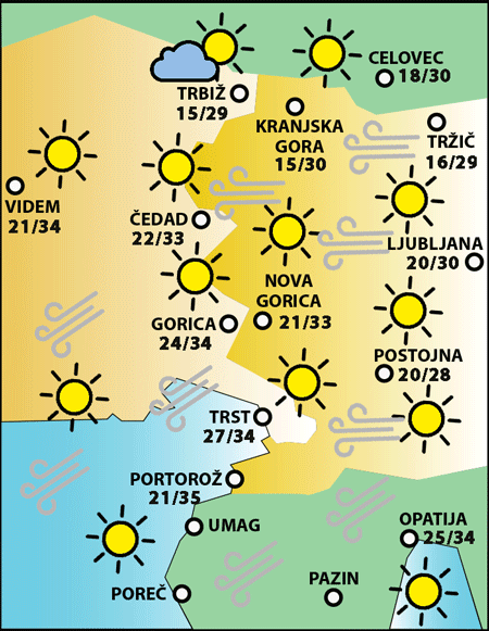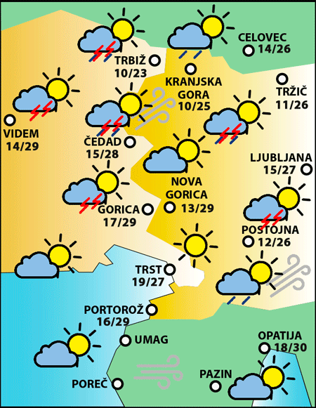 Jutri dopoldne bo na jugovzhodnih območjih jasno. Čez dan bo v hribih spremenljivo z možnimi padavinami in nevihtami. Na obali in na vzhodu bo sončno. Zvečer se bodo lahko pojavljale razpršene nevihte.