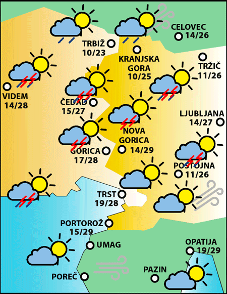 Danes dopoldne bo na jugovzhodu dežele rahlo oblačno. Čez dan bo v hribih oblačno z možnimi razpršenimi nevihtami. Popoldne bo v nižini spremenljivo in se bodo lahko pojavljale nevihte. Na obali bo vreme boljše, čeprav oblačno.