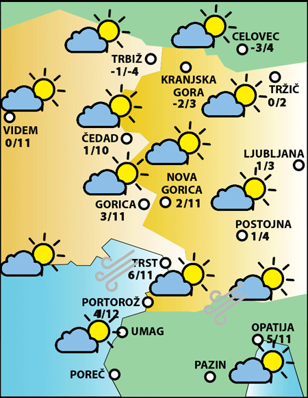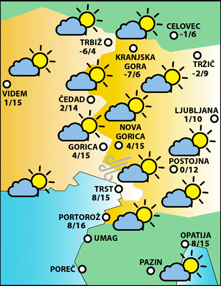 Najnižje jutranje temperature bodo od -7 do 0, ob morju okoli 5, najvišje dnevne od 4 do 10, na Primorskem do 14 stopinj C.
