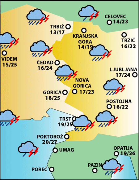 Sprva bo precej jasno, zjutraj bo ponekod po nižinah kratkotrajna megla. Čez dan bo spet spremenljivo oblačno s krajevnimi plohami in nevihtami.