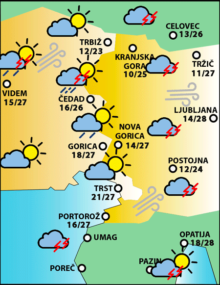 Vremenska napoved je delno negotova. Od popoldneva naprej se bo vreme poslabšalo, nastale bodo plohe ali nevihte, predvsem proti večeru v notranjosti in v hribovitem svetu. Ob morju bo od popoldneva dalje pihala zmerna burja.