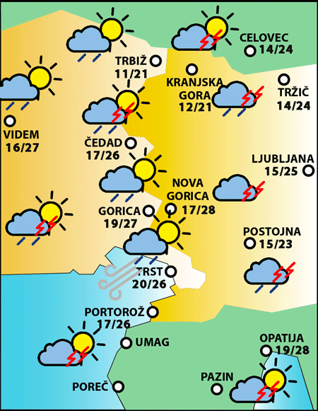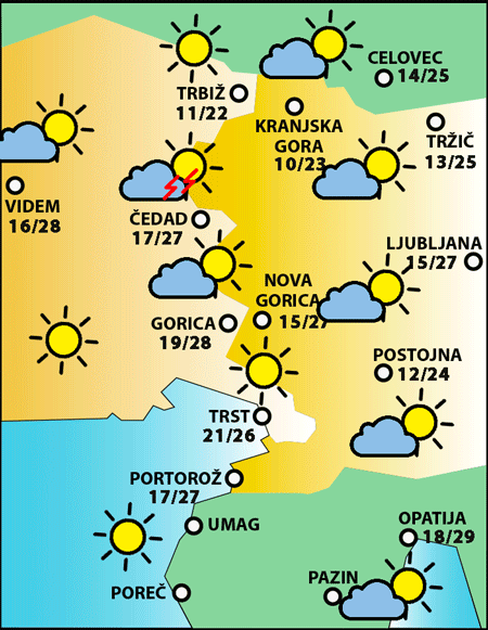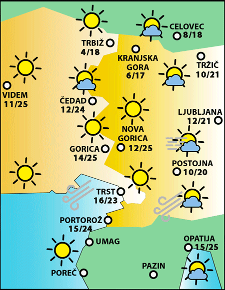 V nižinskem pasu in na obali bo jasno vreme, v hribovitem svetu bo zmerno oblačno; nekaj več oblačnosti bo na vzhodnem pasu. Ob morju bo zjutraj pihal burin, čez dan pa vetrovi raznih smeri. Zvečer bo ponekod prisotna megla.