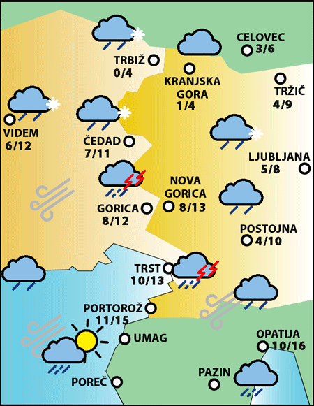 Pretežno oblačno bo s padavinami, ki bodo v glavnem zmerne, možna bo kakšna posamezna nevihta. Ob morju bo pihal zmeren južni veter.
