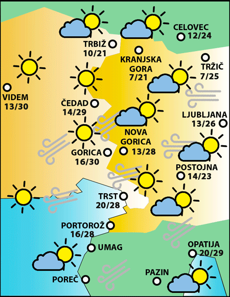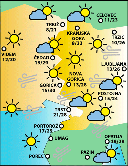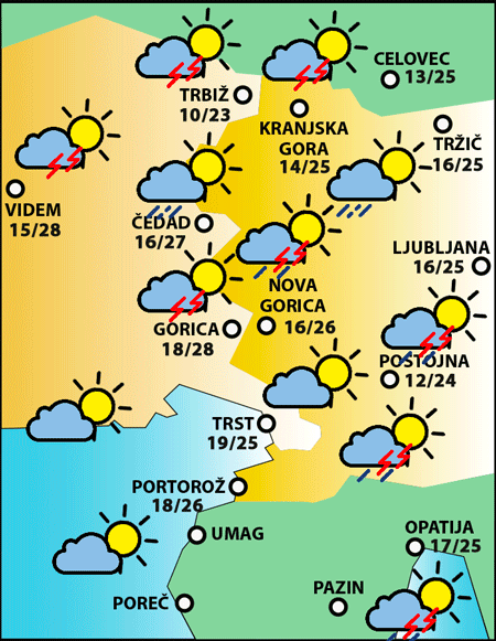 Zjutraj bo verjetno lepo in le rahlo oblačno vreme. Pozno popoldne bo več spremenljivosti in v večjem delu dežele bodo možne plohe in nevihte, manj verjetne bodo na območju lagune.