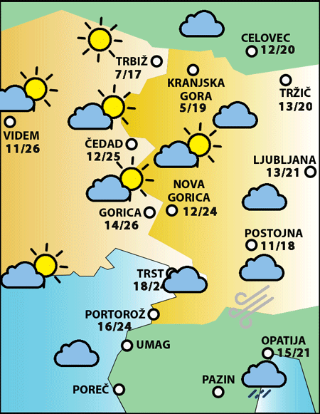 Dopoldne bo rahlo oblačno in stanovitno vreme; od popoldneva bo več spremenljivosti z možnimi plohami in krajevnimi nevihtami, ki bodo verjetnejše v Predalpah.