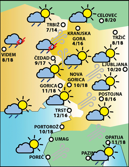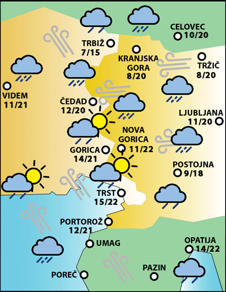Vremenska napoved Hidrometeorološkega zavoda Republike Slovenije in deželne meteorološke opazovalnice ARPA.