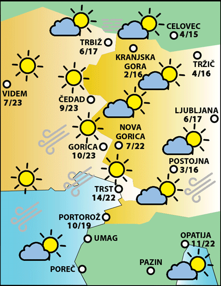 Jutri bo sprva sončno z jutranjo meglo. Popoldne in zvečer se bo od vzhoda oblačnost postopno povečala. Zapihal bo veter vzhodnih smeri, na Primorskem šibka do zmerna burja.