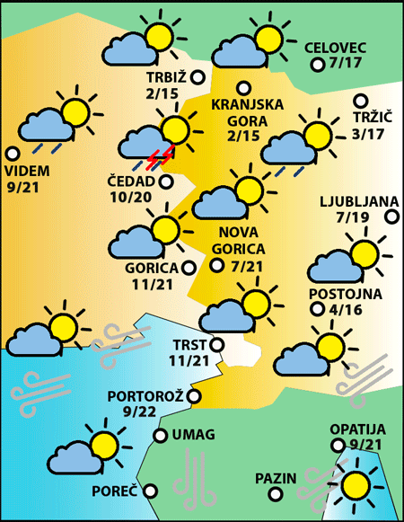 Vremenska napoved Hidrometeorološkega zavoda Republike Slovenije in deželne meteorološke opazovalnice ARPA.