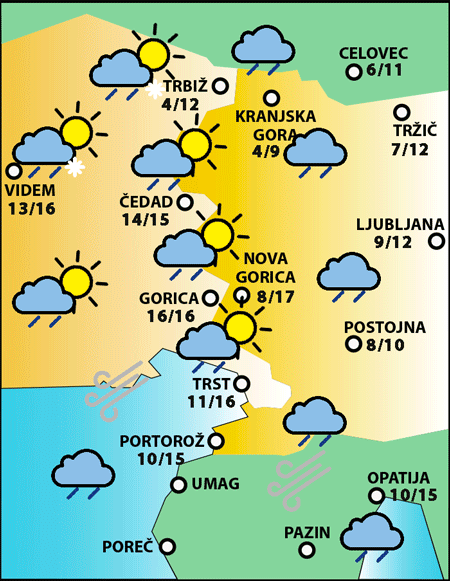 Jutri bo oblačno in bo deževalo predvsem na vzhodu Slovenije. Na Primorskem bo pihala šibka burja.