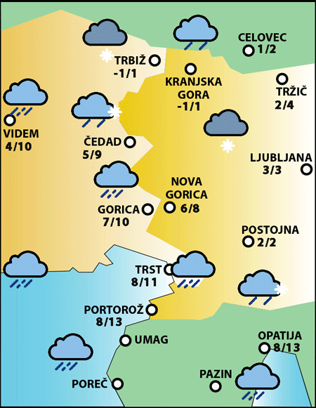 Pretežno oblačno bo. Čez dan bo deževalo; na zahodu bodo padavine zmerne, na vzhodu pa znatnejše. Nad okoli 1300-1400 m bo snežilo. Ob morju bo pihal zmeren južni veter.