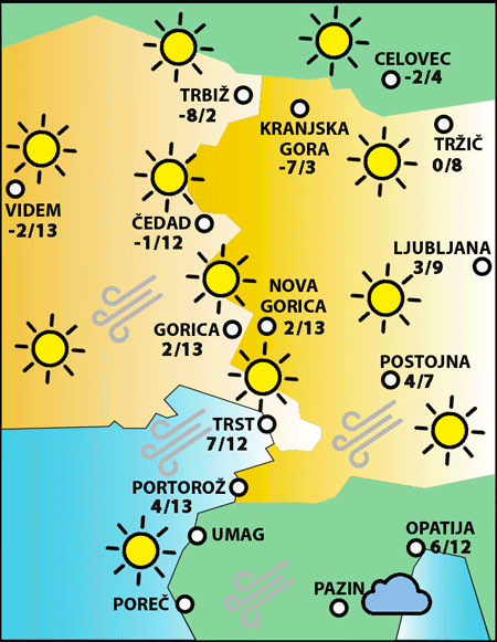 Najnižje jutranje temperature bodo od -2 do 5, v alpskih dolinah do -6, najvišje dnevne od 4 do 8, na Primorskem do 13 stopinj C.