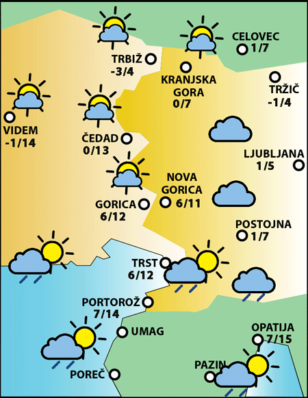 Večinoma bo oblačno. Predvsem v južni in zahodni Sloveniji bo občasno možen rahel dež. Na Notranjskem in Kočevskem ni povsem izključen pojav poledice.