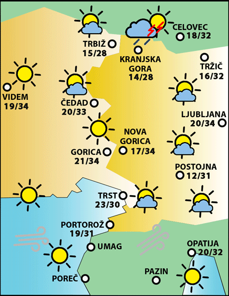 Danes bo na obali in v nižini jasno, v hribih pa rahlo oblačno. Popoldne bo na obali pihal morski veter. Vroče bo predvsem v nižini.