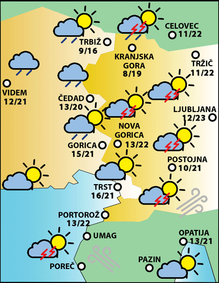 Danes bo delno jasno s spremenljivo oblačnostjo, ki je bo več na zahodu in severozahodu. Predvsem v zahodnih in osrednjih krajih bodo čez dan nastale krajevne plohe, možne bodo tudi posamezne nevihte. Ponekod bo pihal južni do jugovzhodni veter, ob morju jugo.