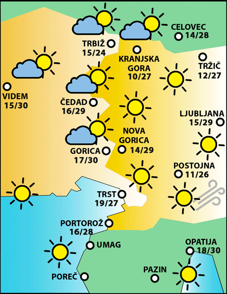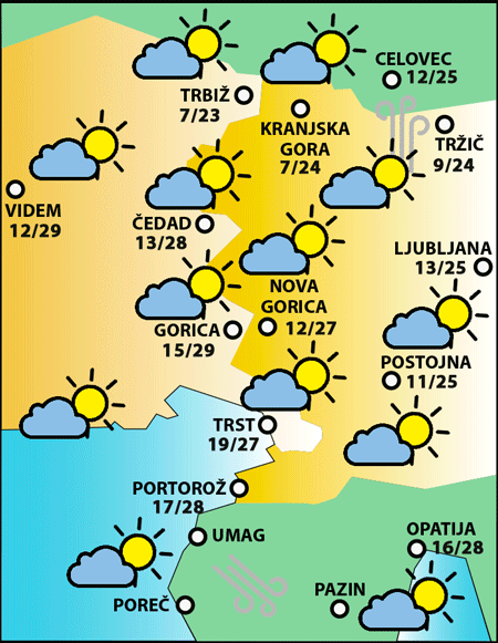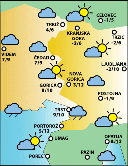 Vremenska napoved Hidrometeorološkega zavoda Republike Slovenije in deželne meteorološke opazovalnice ARPA.